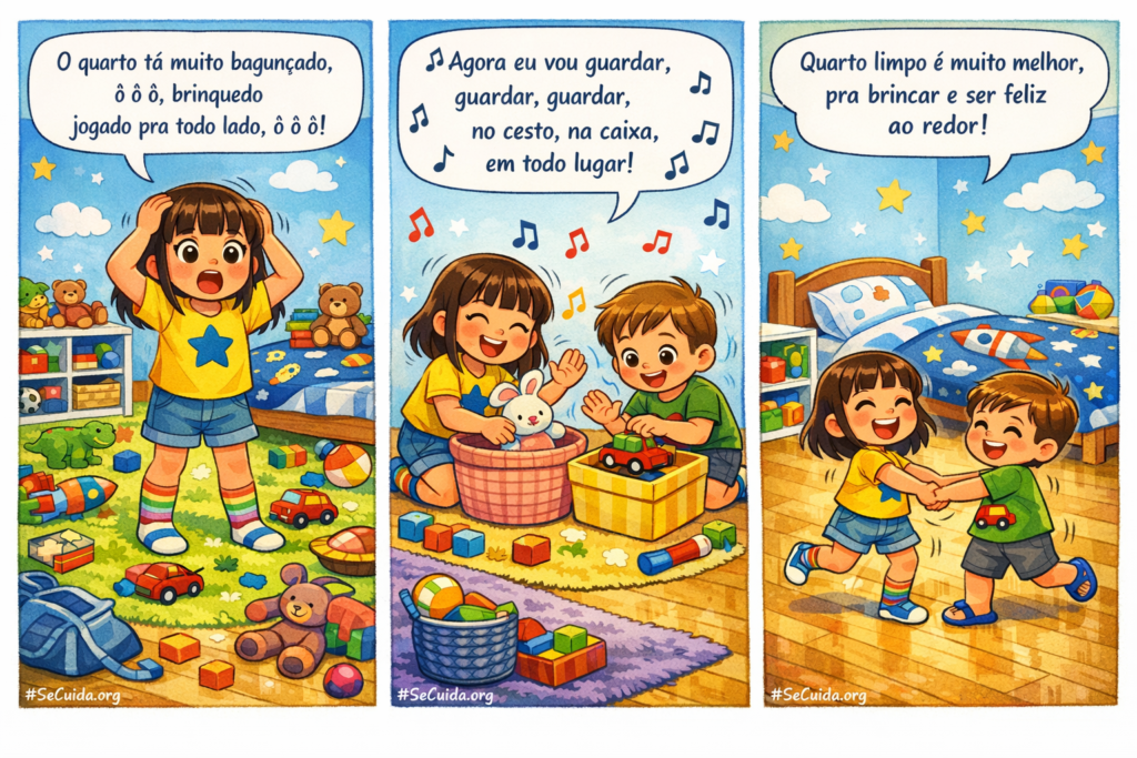 A cena começa em plano geral do quarto infantil colorido, de tamanho médio, com paredes em tom azul-claro e adesivos de estrelas amarelas e nuvens brancas, cama ao fundo com edredom de foguetes e planetas, estante baixa branca com nichos coloridos e muitos brinquedos espalhados sobre o tapete redondo verde-limão. A câmera se aproxima em leve travelling para um plano médio de Sofia, menina de 6 anos, pele clara, cabelo castanho-escuro liso na altura dos ombros com franjas retas, olhos castanhos grandes, usando camiseta amarela com estampa de estrela azul, short jeans azul-claro e meias coloridas listradas, que está de pé no meio da bagunça, com expressão de espanto exagerado, mãos na cabeça. Ao lado dela, aparece Miguel, menino de 4 anos, pele clara, cabelo castanho-claro curto e levemente arrepiado, olhos castanho-claros, camiseta verde com desenho de carrinho vermelho, bermuda de moletom cinza e chinelos azuis, segurando um carrinho na mão e olhando em volta assustado com a bagunça. No áudio, entra uma batida simples de violão e palminhas em ritmo de música infantil, em português do Brasil. A Narradora/Cantora, voz feminina adulta, suave e alegre, começa a cantar em tom brincalhão, enquanto Sofia e Miguel fazem pequenas dancinhas, balançando o corpo e apontando para os brinquedos no chão. Sofia mexe a boca sincronizada, como se acompanhasse a melodia, apontando para o chão. Miguel imita os gestos dela, com um pouco de atraso, criando um efeito engraçado.